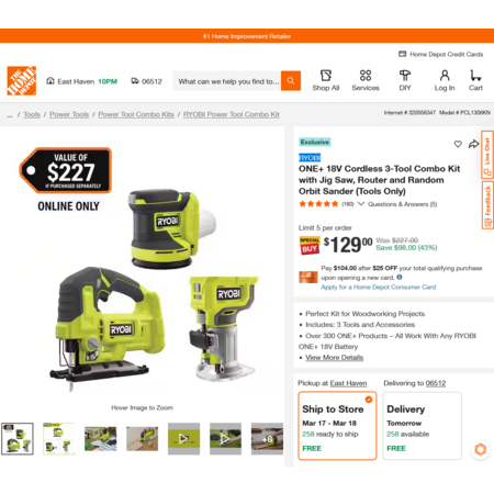 | Product Description: | Expand your RYOBI 18V ONE+ System with the RYOBI 18V ONE+ 3-Tool Combo - Jig Saw, Random Orbit Sander and Compact Router. This combo is able to tackle a variety of woodworking applications. The Jig Saw has the power for fast, precise cutting with 0 - 3,000 SPM and enhanced cut control with 30% reduced vibration. The Random Orbit Sander creates a smooth, swirl-free finish with 10,000 OPM. This tool also features hook & loop fastening for quick sandpaper attachment and on-board dust collection for easy clean up. The Compact Router provides fast, powerful cutting with 20,000 - 30,000 RPM. The variable speed dial allows the user to create precise and accurate cuts for multiple applications. Best of all, this combo is part of the RYOBI 18V ONE+ System of over 300 Cordless Products that all work on the same battery platform. This 18V ONE+ 3-Tool Combo is backed by the RYOBI 3-Year Manufacturer's Warranty and includes (1) PCL525 18V ONE+ Jig Saw, (1) PCL406 18V ONE+ Random Orbit Sander, (1) PCL424 18V ONE+ Compact Router, Jig Saw Blade, Hex Key, Sandpaper Assortment, Dust Chute, Collet Wrench and Operator’s Manuals. Battery and charger sold separately. |
