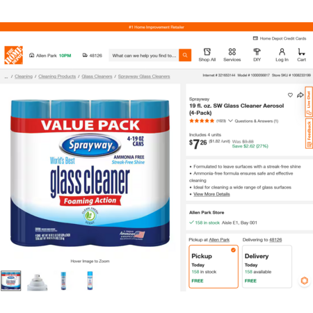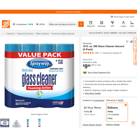 YMMV - Select Home Depot Stores: Sprayway 19 fl. oz. SW Glass Cleaner Aerosol (4-Pack). Free Delivery $7.26