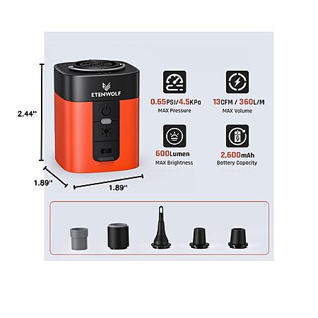 ETENWOLF AIR 3 Air Pump for Inflatables with 2600 mAh Battery & Camping Light, Ultra-Fast and Mini Electric Air Pump $18.69