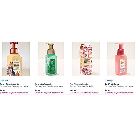 http://www.bathandbodyworks.com/c...hand-soaps. Add eligible items to cart and enter promotion code TROPICLUV during checkout. Eligible items will be adjusted at checkout, up to the limit.