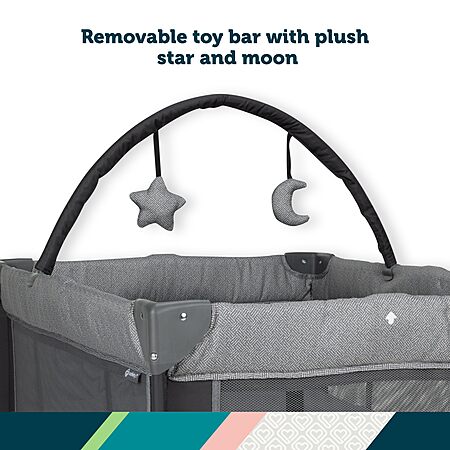 - FULL-SIZE INFANT BASSINET WITH TOY BAR When your baby is done resting, the full baby bassinet zips away for easy removal, so they can use the play yard. For added fun, babies will enjoy the soft plush animals on the toy bar.