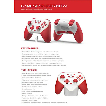 GameSir - Super Nova Wireless Gaming Controller Nintendo Switch & Switch 2/PC/iOS/Android, Hall Effect Stick/Trigger Charging Dock - Red/White $30 at BestBuy