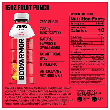 Model: BODYARMOR ZERO Sugar Fruit Punch Electrolyte Drink, Natural Flavors, 16 Fl Oz Bottles (6 Pack), B Vitamins & Antioxidants Sugar Free Hydration