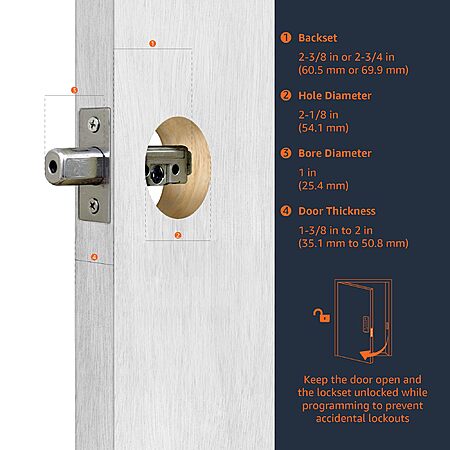 - Secure keyless entry: keypad function and motorized deadbolt for convenient one-touch locking; meets ANSI grade 3 standards for security and strength.Note: Measure your door's backset, cross bore and thickness to ensure you find the right fit.Note: Measure your door's backset, cross bore and thickness to ensure you find the right fit.