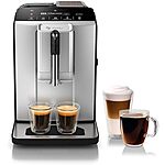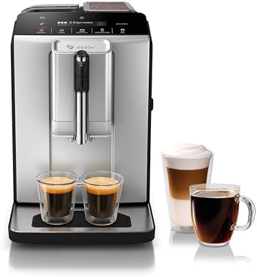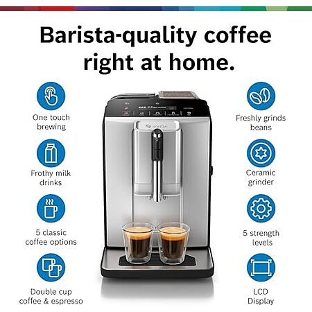 Model: Bosch TIU20307 300 Series Fully Automatic Espresso Machine with Milk Express (in-cup frother), LCD + Touch Control Panel, OneTouch Milk-based Beverages and 5 Beverage Options, in Silver