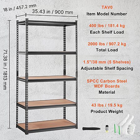 Amazon.com has VEVOR Storage Shelving Unit, 5-Tier Adjustable, 2000 lbs Capacity, Heavy Duty Garage Shelves Metal Organizer Utility Rack, Black, 36" L x 18" W x 72" H for Kitchen Pantry Basement Bathroom Laundry on sale for $47.59. Shipping is Free.