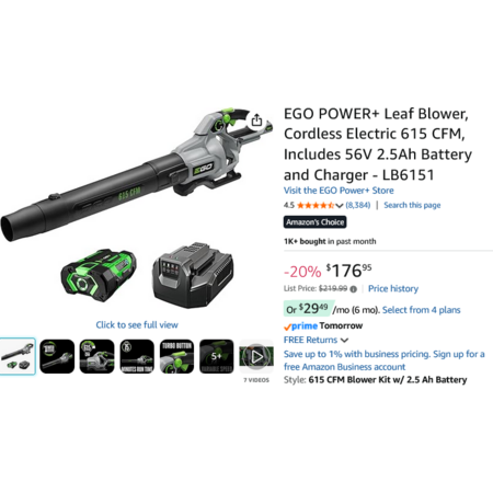 EGO POWER+ Leaf Blower, Cordless Electric 615 CFM, Includes 56V 2.5Ah Battery and Charger - LB6151 $176.95
