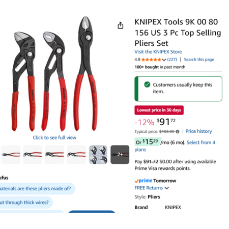 KNIPEX Tools 9K 00 80 156 US 3 Pc Top Selling Pliers Set $91.72