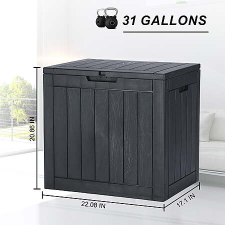 | Product Description: | Introducing the perfect solution for your outdoor storage needs! This Outdoor Storage Box is crafted from durable, waterproof resin , ensuring your belongings are safe and protected from the elements. Designed with convenience in mind, it’s perfect for storing package deliveries, patio cushions , garden tools, and more. Its sleek, modern design complements any outdoor space, while its robust construction offers reliable storage. Assembly is straightforward, requiring minimal tools. Enhance your patio or garden with this versatile storage box, combining practicality and style for a clutter- free environment. Compact But Versatile: outdoor storage box measures 22.8''L x 17.1''W x 20.86'H. Even with a storage capacity of 31 gallons, you can fit many backyard extras like patio mats, pillows, pool accessories, gardening tools and hoses, etc Ideal Storage: 30 gallon storage capacity perfect for use as a small storage option Resin Construction: It's made out of all weather-resistant resin with an appealing wood-look texture Durable and Strong: Weather-resistant polypropylene construction prevents rusting, peeling and denting - unlike real wood Easy Assembly: Simple and quick assembly with no extra tools required |