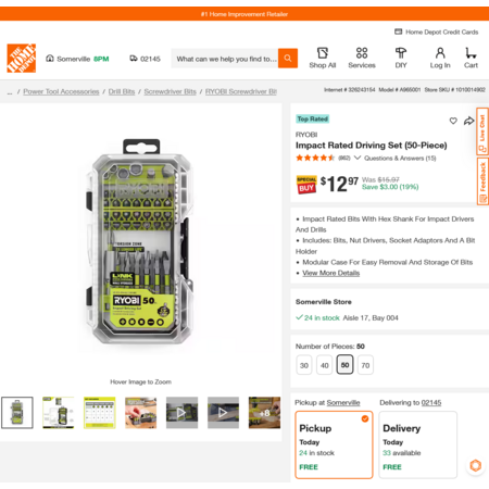 RYOBI Impact Rated Driving Set (50-Piece) $12.97
