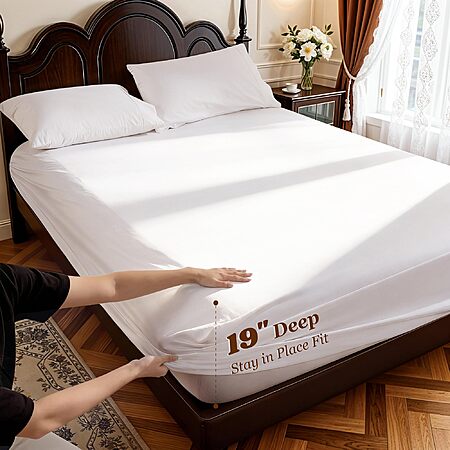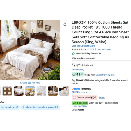LBRO2M 100% Cotton Sheet Set, Deep Pocket 19", 1000 Thread Count, 4 Piece Set (King, White). YMMV - Coupon Price $50.65