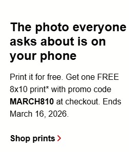 Print it for free. Get one FREE 8x10 print* with promo code MARCH810 at checkout. Ends March 16, 2026.