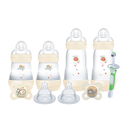 PRODUCT DETAILS - MAM Welcome Home Gift Set (9-count): 2 - 5 oz MAM Easy Start Anti-Colic bottles with Size 1 Bottle Nipples, 2 - 9 oz MAM Easy Start Anti-Colic bottles with Size 2 Bottle Nipples, 1 – Original Start pacifier 0-3 months, 1 – Original Night pacifier 0-6 months, 1 – Size 0 bottle nipple, 1 – Size Bottle Nipple, 1 – Training toothbrush