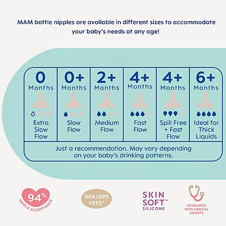 GREAT FOR BREASTFEEDING MOMS – 94% of babies accept our SkinSoft nipple which mimics breastfeeding and supporting healthy jaw and teeth development. making these MAM bottles, pacifiers & nipples the best for a breastfed baby.