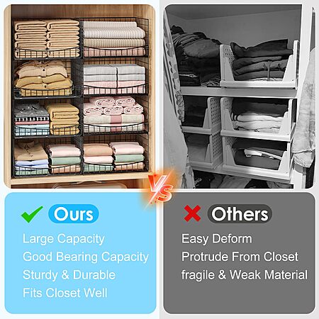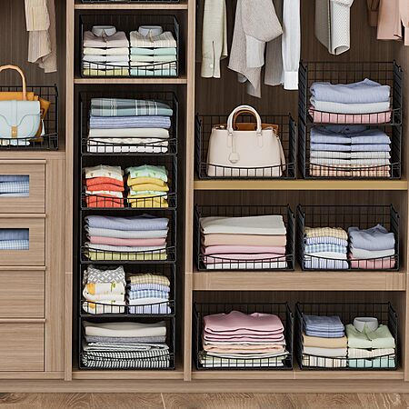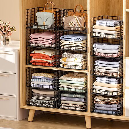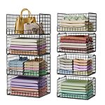 - 【Space-saving & Efficient Storage】:The bottom of the 4-tier close organizer shelf bins are equipped with card slots for multi-layer stacking, maximizing the use of vertical space, adding extra storage space to the wardrobe and keeping clothes in order.