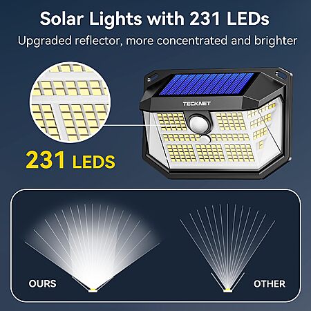 Model: TECKNET 231 LED Solar Motion Lights Outdoor Waterproof, 4 Pack 300° Angle & 3 Lighting Modes PIR Motion Sensor Security Solar Wall Lights IP65 for Fence Front Door Yard Deck Garden Garage