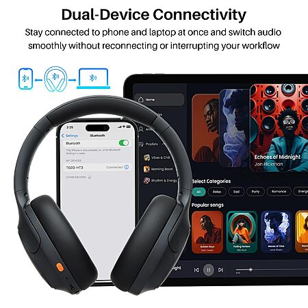 Model: TOZO HT3 Hybrid Noise Cancelling Headphones, 90H Playtime Wireless Over Ear Bluetooth Headset, Spatial Audio AI Chat with 5 Mics, Supports Dual Connection and USB-C Input, with 32 EQ Music Modes