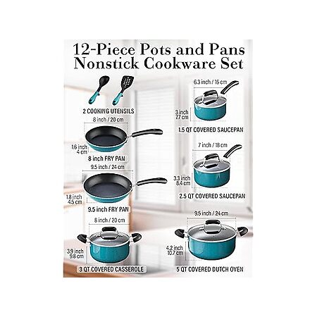 - Multi Use Cookware Set: 12 Piece nonstick pots and pans set includes: 1.5 and 2 quart saucepans with lids, 3 qt casserole with lid, 5 qt dutch oven/stockpot with lid, 8 inch and 9.5 inch fry pan, nylon spatula and spoon