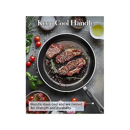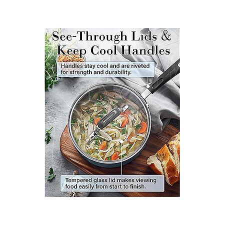 - Ergonomic Handle: The cookware set features riveted stainless steel and plastic handles, providing a safe and secure grip that stays cool; The tempered glass lids have steam vents, allowing you to view food while keeping heat and moisture in