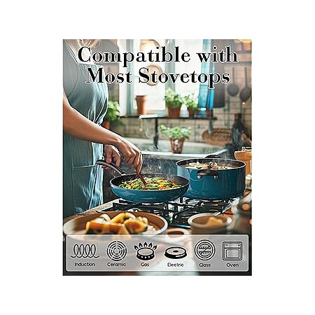 - Works on All Stovetops: Nonstick cookware set compatible with induction, gas, electric, glass, ceramic, halogen, and more. Oven safe up to 350°F and dishwasher safe