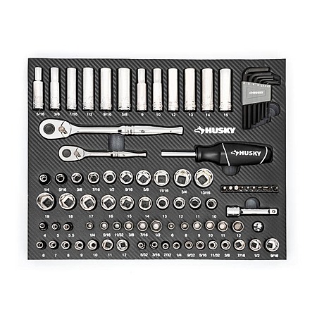 Home Depot has cut the price of this Husky Mechanic's Tool Set. Features 53 different standard and deep sockets, 1/4 in. and 3/8 in. drive 72-tooth ratchets. Set also includes 37 accessories, 2 extensions and 2 ratchets set in EVA foam trays to keep it all organized.