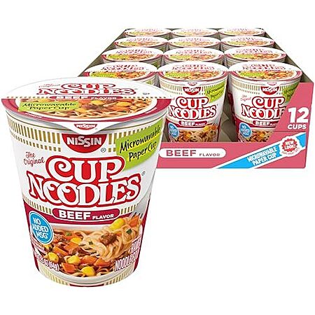 Nissin Cup Noodles Soup, Beef Flavor, Microwaveable Paper Cups, Instant Ramen, 2.25 Ounce (Pack of 12)~$4.22 With S&S @ Amazon