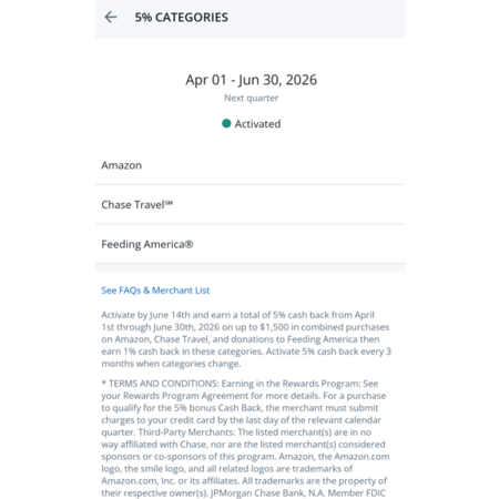 Chase Freedom 5% Cash Back Categories Ready To Be Activated APRIL - JUNE - Amazon, Chase Travel, Feeding America