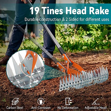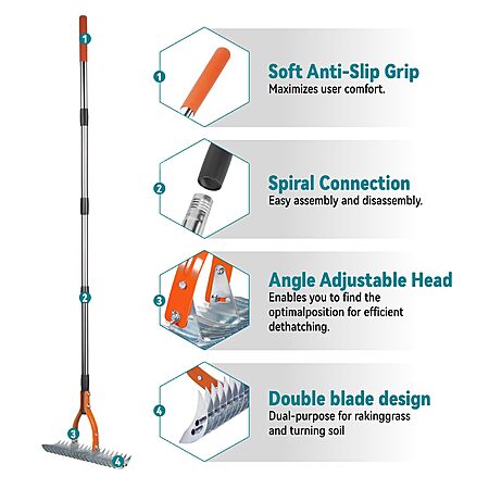 Product Description from Amazon:- 【Carbon Steel & Durable Construction】Our thatch rake teeth is made of premium carbon steel with anti-rust powder coating. The dethatcher rake head has 3mm thickness, so you will not experience head tooth break or deformation. This garden rake with two sides function, best for removing weeds, thatch, grass, gravel, construction debris, prepping for laying down seeds.