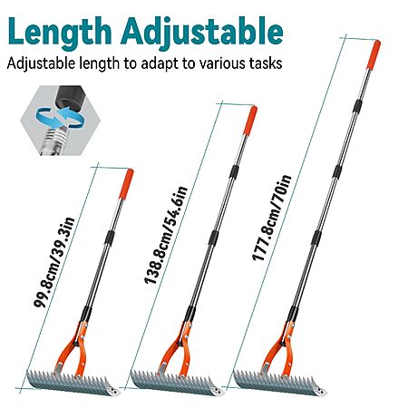 - 【70'' Long Section Handle】The dethatching rakes handles are made to screw together in smooth metal, with different length options. This feature of the metal rake heavy duty allows you to use the lawn rake for different purposes and adapt it to your height. The yard rake also has a non-slip texture, which makes it comfortable to hold, enhances grip and prevents accidents.