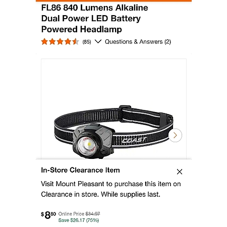 YMMV Clearance. Select Home Depot stores. Coast FL86 headlamp 840 Lumens. Comes with alkaline batteries(rechargeable upgrade battery sold separately).