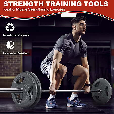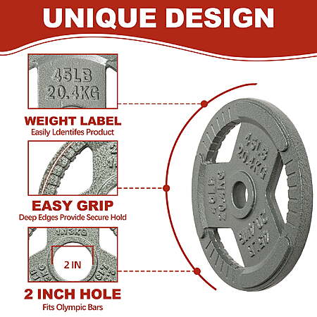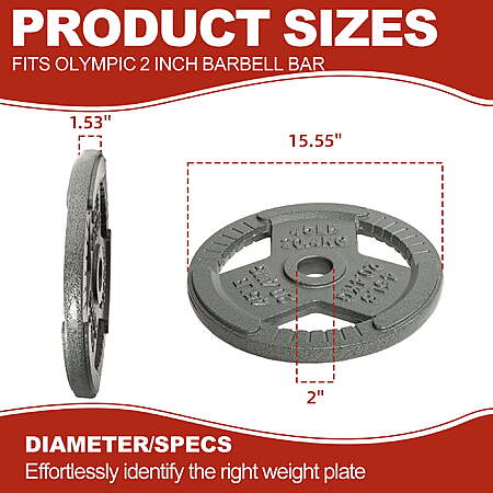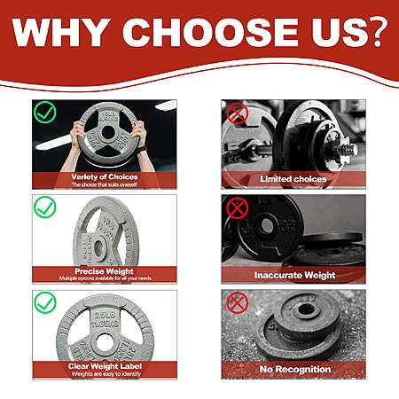 | Product Description: | Build strength and endurance with the Signature Fitness Cast Iron Weight Plates, designed for long-lasting performance and versatility. Each plate is made from solid cast iron with a durable enamel finish that resists rust, corrosion, and everyday wear. The 2-inch center hole ensures a secure fit on all Olympic barbells, providing stability and balance during lifts. Available in multiple weight options, these plates are ideal for powerlifting, strength training, and general fitness routines. Perfect for home or commercial gym setups seeking reliable and professional-quality equipment. Olympic-Sized Design: Built with a precision 2-inch center hole that fits all standard Olympic barbells and dumbbell handles for a secure and stable workout experience. Premium Cast Iron Build: Crafted from solid cast iron to deliver maximum durability and dependable performance through every lift, squat, or press. Rust-Resistant Finish: Features a baked enamel coating that resists rust, corrosion, and chipping—keeping your plates looking new even after years of use. Easy-to-Handle Grip: Each plate includes three large grip openings with textured anti-slip surfaces, making loading, unloading, and transport safe and effortless. Versatile Weight Options: Available in sets of 2.5LB, 5LB, 10LB, 25LB, 35LB, and 45LB—perfect for customizing your strength training routine and achieving progressive gains. |