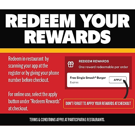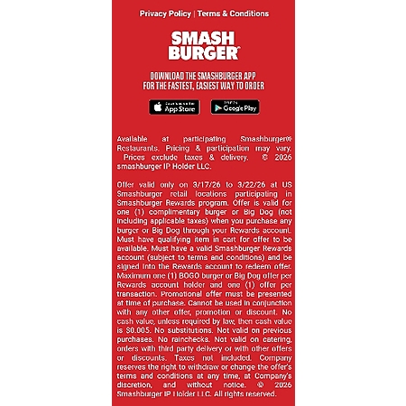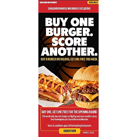 Buy one, get one free for the opening round (March Madness). This week only, from 3/17 to 3/22, buy any burger or big dog and score another for free. One redemption per SmashRewards member account. Redeem in app or on their website.