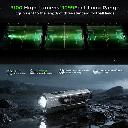 3100lm Power & 335m Throw – Bright spotlight reaches up to 335 meters, easily illuminating backyards, trails, or work sites, perfect for night searches, repairs, and emergency lighting.
