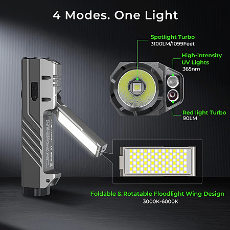 4-in-1 Multi-Function Light – Includes spotlight, wide floodlight, red light (8–90lm, 3 levels), and 365nm UV light (700–1600mW) for outdoor, night, and work use: red light for low-disturbance night vision, UV light for inspections, detecting leaks, cracks, or hidden markings in maintenance and repair tasks.