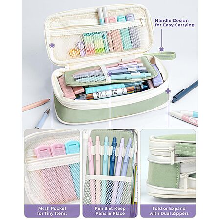• LARGE CAPACITY PENCIL BAG: This expandable pencil bag, featuring a double zipper design, offers extra storage space and organization. Made from soft, durable polyester fabric, it has four compartments to keep supplies neatly in place. The waterproof material and smooth zipper provide easy access and long-lasting protection for your stationery. Whether you're heading to college or the office, it is the perfect size to keep your writing tools and art supplies organized in one compact and easy-to-carry