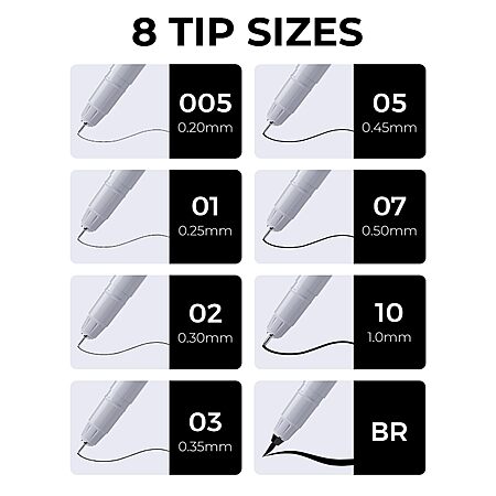• Ultra-Fine, Fine Point, Brush 8-Size Tips: JusArt fineliner pen set includes 8 tip sizes—0.2mm (005), 0.25mm (01), 0.3mm (02), 0.35mm (03), 0.45mm (05), 0.5mm (07), 1mm (10), and Brush (BR)—allowing you to create everything from delicate, fine lines to bold, expressive strokes. Perfect for detailed drawing, illustrations, sketches, journaling, and art projects of all kinds