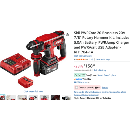Skil PWRCore 20 Brushless 20V 7/8" SDS+ Rotary Hammer Kit, Incl 5.0Ah Battery, Jump Charger & USB Adapter - RH1704-1A. YMMV - Coupon Price $119.24