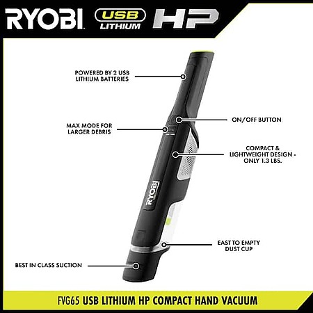 RYOBI USB Lithium HP Compact Hand Vacuum Cleaner Kit with (3) USB Lithium 2.0 Ah Batteries and Charger $79.98