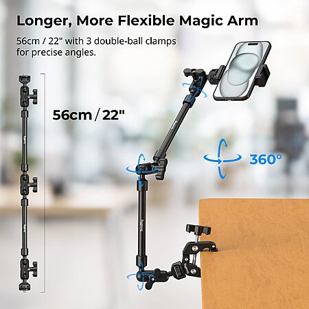 - Longer & More Flexible Magic Arm: 56cm/22" arm, 600g/21oz load capacity, double-ball clamps for independent angle adjustments. Ideal for overhead shooting, live streaming, vlogs, stop-motion videos, and video conferencing.