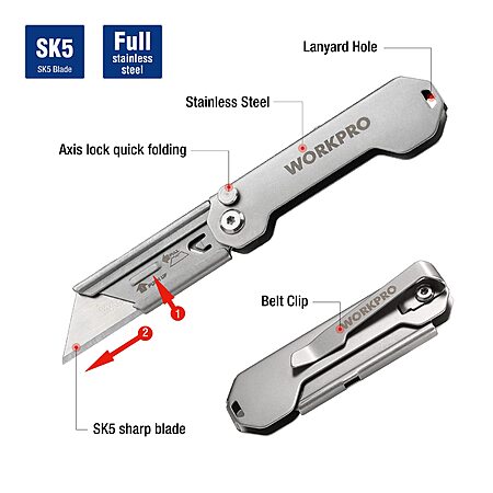 UE Direct via Amazon.com has WORKPRO EDC Folding Utility Knife, Mini Box Cutter with Quick Open Axis Lock, Quick Change Blade Razor Knife, Foldable Small Pocket Knife with Belt Clip on sale for $7.99.