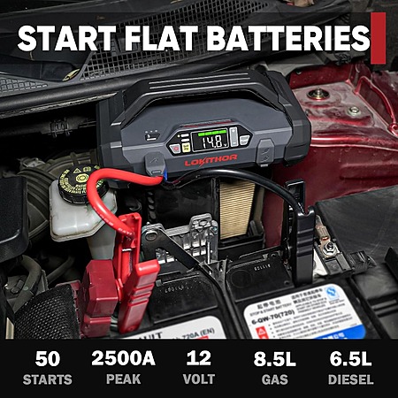 Features:- 2500A Peak Jump Starter: Starts gas engines up to 8.5L and diesel up to 6.5L in seconds; up to 50 jump starts per charge
