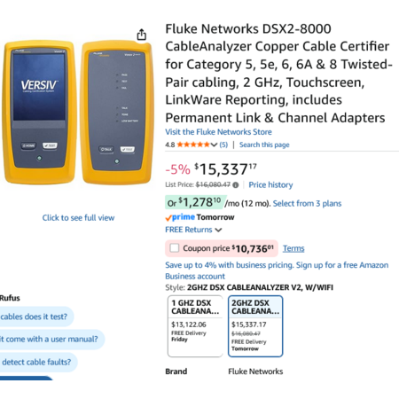 Fluke Networks DSX2-8000 CableAnalyzer Copper Cable Certifier for Cat 5, 5e, 6, 6A & 8 Twisted-Pair cabling, 2 GHz. YMMV - Coupon Price $10,736.01