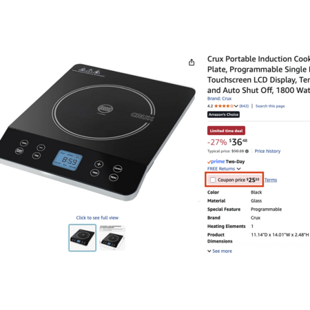 YMMV Crux Portable Induction Cooktop, Programmable Single Burner Touchscreen LCD Display, Temperature Control, Auto Shut Off, 1800 Watt, Black $25.53 AC