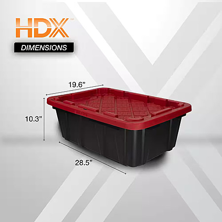 This heavy-duty HDX 14-Gallon Tough Tote is designed to handle all your storage needs. The recessed lid enables you to stack multiple units effortlessly, while the tapered design facilitates easy nesting when you need to store them. With a sturdy black base crafted from high-grade resin and a red snap lid, your items are safe and protected. Ideal for the thorough organizer seeking top-tier storage solutions, this tote features integrated slots for locking to deter unwanted access. Its unique tie-down channels also make it easy to secure for hassle-free transport and it's compatible with most hitch mounted cargo carriers. So that you can easily recognize what size your tote is, the gallon size is clearly visible on both the base and the lid. Embrace the essence of organized living with HDX Tough Totes!