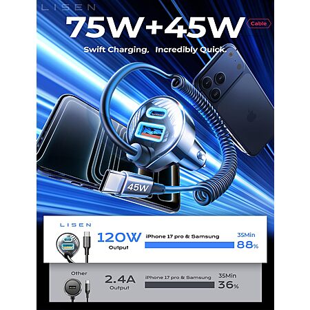 Product Description from Amazon:- 2026 New Upgrade: More Power, Same Price—65W→90W : LISEN 90W USB-C car charger with 45W coiled cable charges your iPhone 17 16 15 All Series and later (not compatible with iPhone models below 15) Samsung Galaxy S25 Ultra from 0% to 80% in 30 minutes, reducing charging time by 80%.