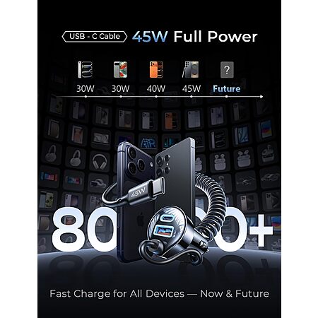 - 45W Super Fast Built-in USB-C Coiled Cable: The coiled design ensures no tangled cords and eliminates the need for multiple cables. It extends to the desired length, maintaining a clean, tidy dashboard without clutter. Plus, the low-profile plug stores neatly inside the console so the lid closes flush—unlike many retractable cable heads that are too bulky and jam the lid.
