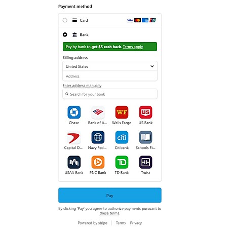 Note: Some banks are ineligible, like some online-only banks will not be accepted. Standard big banks should work fine. You'll get a pop-up if it won't work for your mobile/cloud bank.
