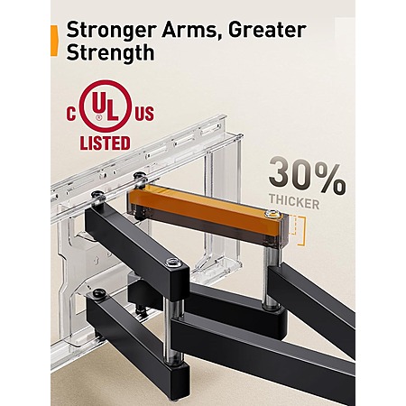 - Solid and Sturdy: Made of heavy-duty steel and dual articulating arms that are 30% thicker, this TV wall mount is UL certified for its performance, durability, and safety, and can easily hold up to 132 lbs. The tv wall mount bracket is equipped with security locks and anti-drop end caps for dependable security.