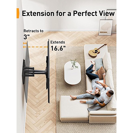 - Space-Saving Design: The articulating wall mount tv bracket with dual swing arms can extend 16.6" for viewing and retracts back to 3" for a low-profile look. The wall plate has openings to mount over an electrical plate for better cable management and organization.
