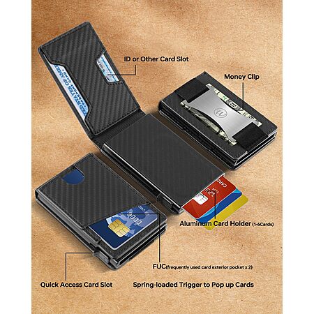 Amazon[amazon.com] has Wellnec Slim Minimalist Pop Up Card Wallet w/ RFID Blocking & Money Clip (Holds 9-12 Cards) for $5.71. Shipping is free w/ Prime or on $35+.